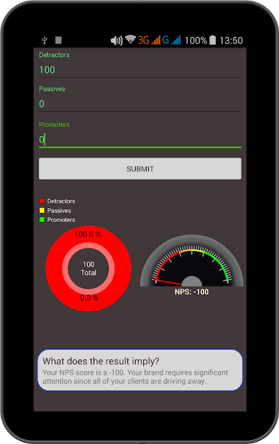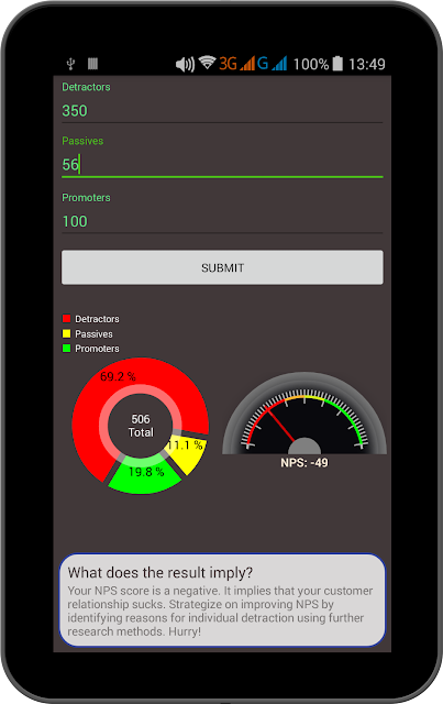 With me doing the charting part and my friend doing the result implication and significance part we developed a simple NPS calculator app that takes total detractors, passives and promotors to output NPS. Refer to the screenshots below to identify what different NPS score signify.