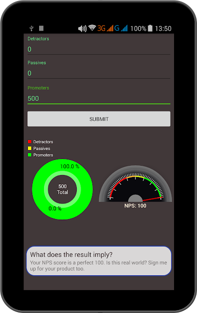 With me doing the charting part and my friend doing the result implication and significance part we developed a simple NPS calculator app that takes total detractors, passives and promotors to output NPS. Refer to the screenshots below to identify what different NPS score signify.